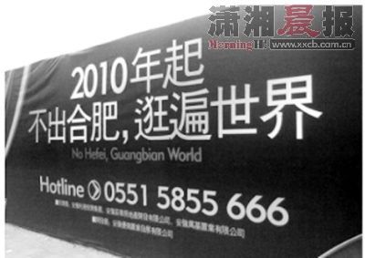 據《現(xiàn)代快報》報道日前,某新浪微博網友發(fā)布了一張照片,稱:"合肥史上最牛翻譯,頂級翻譯看了都落淚"。圖片顯示的是一則樓盤廣告"不出合肥,逛遍世界",下面赫然顯示著英文翻譯為"NoHeFei,GuangbianWorld"。這條樓盤廣告不但有圖有真相,而且照片上還有樓盤的電話。