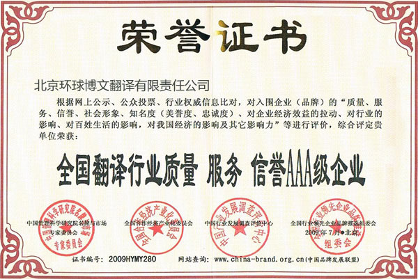 中國語言服務(wù)行業(yè)品牌企業(yè)稱號
